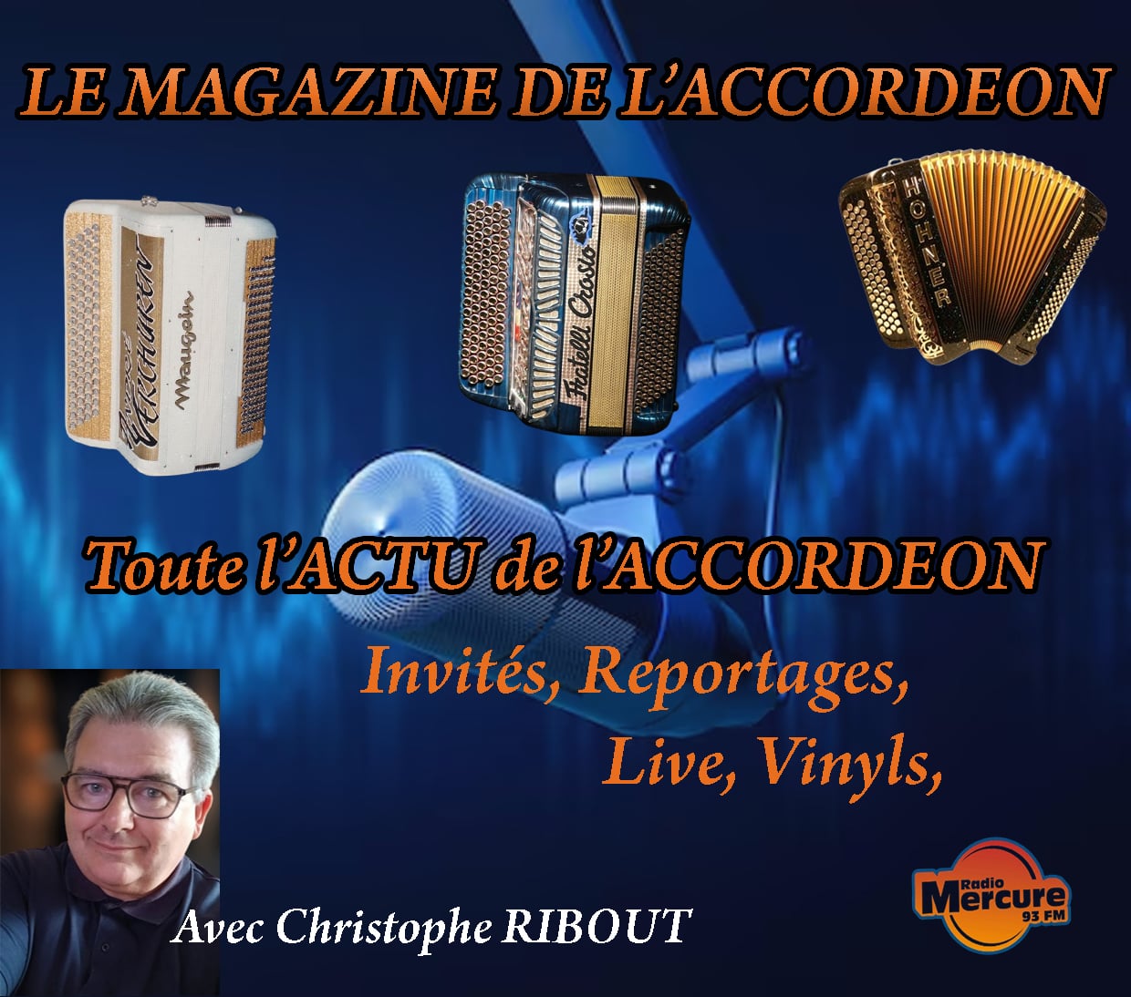 Chaque lundi, je vous retrouve à 11h sur radio mercure pour écouter le meilleur de notre instrument préféré – l’accordéon.Au cours de cette émission, vous pourrez retrouver des invités, des rubriques, des reportages, des « live » de thé-dansant, de concerts et autre surprises. Le Magazine de l’Accordéon, c’est avec Christophe Ribout : – le lundi à…